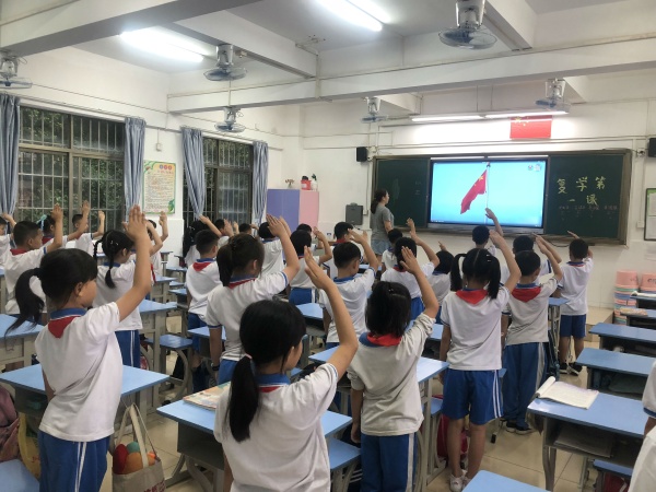 早上7:00,同学们陆陆续续踏进校园,在老师和“大脚丫”的指引下,有序地回到了班级。8:50,胡校长来到各班级,向同学们派发复学礼物——书签,勉励同学们好好学习,将来报效祖国。上午第一节,班主任在教室内组织进行复学后的第一次升旗仪式。同学们面向国旗,敬队礼,唱国歌。接着,一至三年级观看复学第一课《天使归来,英雄开讲》,在视频中感悟当代国人的爱国情怀与责任担当,致敬挺住风雨的坚强脊梁。随后,班主任根据《在校一日生活指南》,指导同学们正确佩戴口罩和七步洗手法等个人防护知识。
