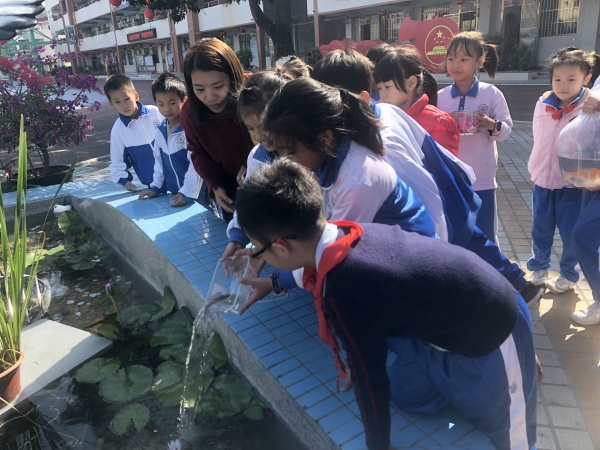 活动伊始,由少先队辅导员阮结连老师向参加活动的师生代表讲解了“班鱼”入池活动的意义,并以现场提问互动的方式与学生交流。各班级学生向大家介绍了本班“班鱼”的名字和品种。随后,德育处阮雪屏主任宣布“班鱼”入池仪式正式开始,各班级有序地向校园主体景观“海阔凭鱼跃”放入“班鱼”。“乐乐”、“学学”、“四喜”等25条“班鱼”正式成为五小的一份子,穿梭在清澈的池水里,一会休憩,一会玩耍,构成了一幅生机勃勃的画面。最后,五小德育处阮雪屏主任结合学校新建成的主题景观对学生进行“爱校爱班爱生”教育,并建议各班级成立“班鱼”守护小组,把学生高度关注的素材作为德育的契机。