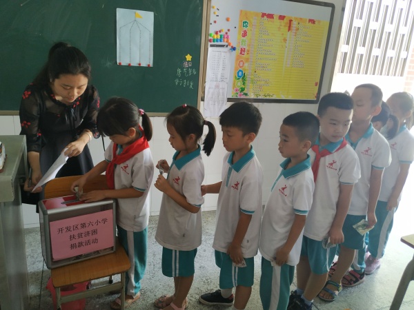“赠人玫瑰,手留余香”,每年的6月30日是广东省的扶贫济困日,为了弘扬中华民族传统美德,积极践行社会主义核心价值观,开发区第六小学响应省捐款活动的号召,于6月28日开展“学子献爱心”捐献活动,号召全体学生伸出援手,为弱势群体捐款献爱心。首先各班班主任在班级进行爱心教育,讲述本次爱心捐款的意义,动员全体学生积极行动起来,为贫困人员献出自己的爱心。