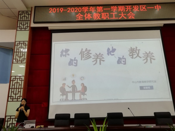 2019年9月1日下午,市教研室办公室主任、德育教研员朱敏嫣老师冒雨来到开发区一中,为老师们开设题为《你的修养,他的教养》的讲座。讲座由开发区一中教导处副主任柏春菊主持。