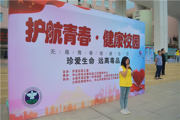 中山市向日葵社工服务中心社工带领火炬区一中学生志愿者表演完禁毒拍手操后,火炬区一中团委书记张铁稳致辞。他希望同学们通过下午的游园活动,进一步了解毒品的危害,从而珍惜生命、远离毒品、拥抱美好人生。他希望大家要认真学习禁毒知识。增强自觉远离毒品意识和抵制毒品的能力;远离毒品,远离游戏厅、网吧等场所,不接触毒品,用健康的行为抵御毒品的侵害,做“珍爱生命,拒绝毒品”的好少年;从我做起,抵制毒品,做到不抽烟,不吸食毒品;不从事毒品违法犯罪活动;主动同毒品违法犯罪行为作斗争。