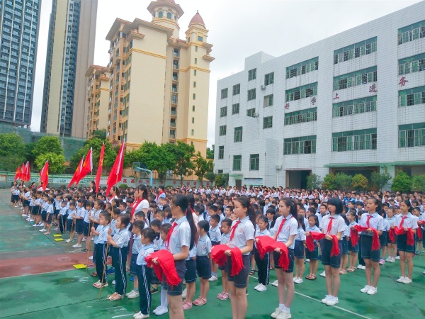 2019年5月31日,中山市火炬开发区新苗学校的校园里,队歌嘹亮。一年级和六年级的全体师生聚集在国旗下,举行了隆重的新队员入队仪式。