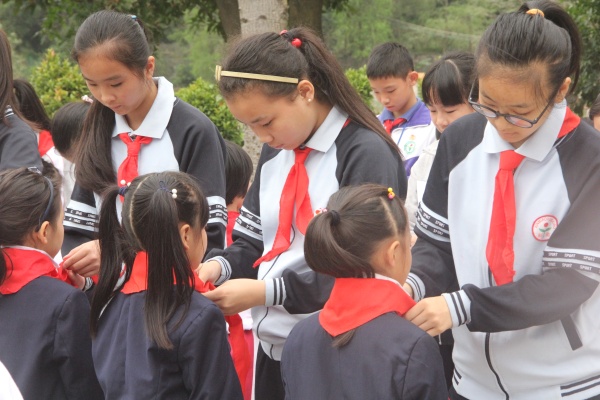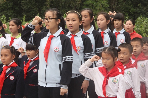 代表发出爱国、爱火炬倡议,呼吁大家积极行动起来,从我做起,从小事做起。然后开始新队员入队仪式,老队员郑重地为新队员系上鲜艳的红领巾,新队员个个神采奕奕,与老队员互敬队礼,并在队旗下庄严宣誓、呼号,表达出他们的心声——“为共产主义事业贡献力量”。