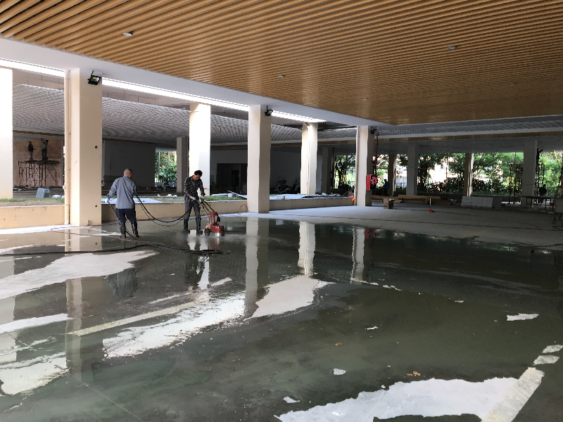 接到任务后,马上查看现场:现有场地以前是一个售楼部的大巴停车场,地面以前做过环氧地坪,有些光滑,有的破烂了,现状不是理想。 第一步:人工凿车位线,这种热熔胶划的车位线本身就有3MM厚了,必须清除; 由于以前做过地板漆,结合现场情况,决定用水磨石机将地面打磨,再用地坪打磨机打磨(磨块为石头):