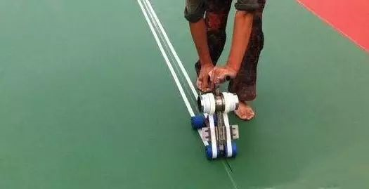 2、用美纹纸沿线位两边粘贴,中间预留宽度尺寸应符合球场的界线宽度要求。