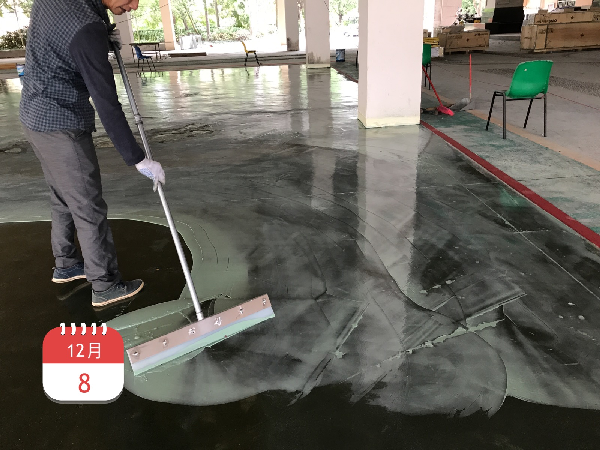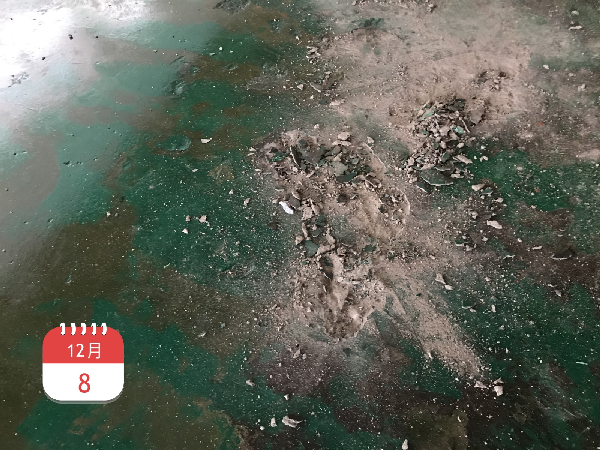 接到任务后,马上查看现场:现有场地以前是一个售楼部的大巴停车场,地面以前做过环氧地坪,有些光滑,有的破烂了,现状不是理想。 第一步:人工凿车位线,这种热熔胶划的车位线本身就有3MM厚了,必须清除; 由于以前做过地板漆,结合现场情况,决定用水磨石机将地面打磨,再用地坪打磨机打磨(磨块为石头):
