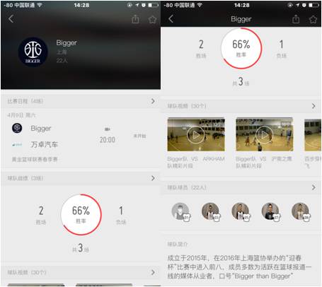 通过联赛页面可直接进入球队页面,查看球队简介、队员、战绩以及视频等,帮助你多方位了解该球队。