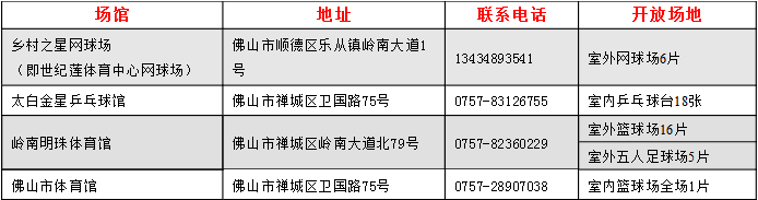 温馨提示:岭南明珠体育馆五人足球场因场地维修,暂恢复开放3片场地。2以下场馆日常免费、低收费开放。8月8日全民健身日,佛山市全民健身中心乒乓球桌、健身器械(限16周岁以上65周岁以下市民使用)免费向市民开放,开放时段为上午9:00-11:00;下午15:30-17:00,请提前在群体通平台预订。