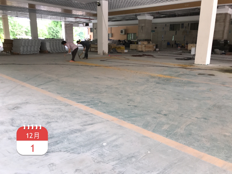 由于以前做过地板漆,结合现场情况,决定用水磨石机将地面打磨,再用地坪打磨机打磨(磨块为石头):