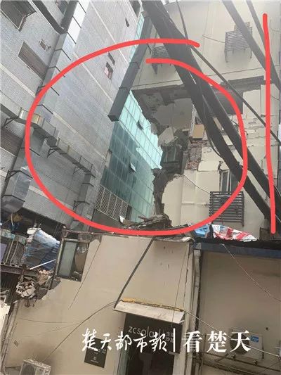 记者无法走进现场,通过目击者拍下的视频可以看到,楼下一片混乱,一至三楼有不同程度的垮塌。