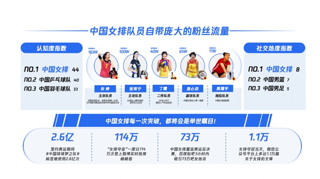 2016年里约奥运会,女排夺冠时刻用户关注度最高尤其临近夺冠时刻,更飙升至近70%。这样的数据不仅在女排这项运动中是一个惊人纪录,即便是放在很多比赛中,同样还是一个难以逾越的纪录。当时的微博话题#中国排球梦之队#的阅读量超过2.6亿,讨论超过23.6万条。网络搜索“中国女排里约奥运会夺冠”,相关结果超过445万个。在今年世界女排国家联赛香港站中国女排与意大利的比赛中,中国女排在0比2落后的情况下又一次完成了经典逆转,该场比赛也毫不意外地成为当天央视体育频道收视率之最。在中国女排团队收获大量关注的同时,很多女排队员也受到了越来越多年轻人的喜爱,其中更有众多自带“饭圈文化”属性的粉丝。