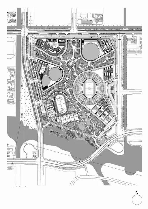 苏州在中国享有园林城市之盛名,新体育中心的总体设计亦秉承中国园林建设的古老传统,以现代手法诠释园林的意韵。自由曲线的园林景观环绕平台基座,基座自周边道路平面油然升起,烘托出其上方的体育场馆。优美弧线型的场馆屋顶如同亭阁楼榭的飞檐,构成景观区的制高点。蜿蜒于景观之中的步行小路提供了观望水景、亭榭式建筑和景观的不同视角,变换多姿,移步易景。体育中心南侧向斜塘河方向展开,并将不同体育设施与景观有机地融合。