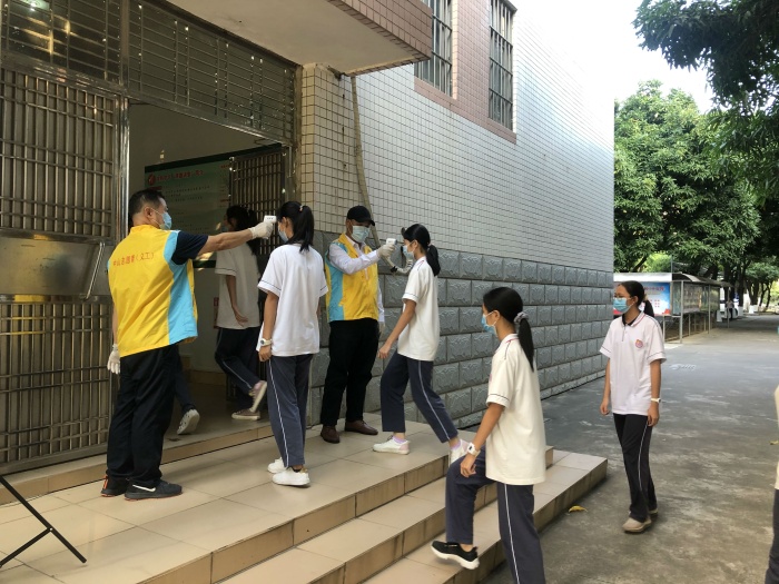 在校门口师生员工入校检测体温演练中,值班教师模拟在入校指定通道内对测师生体温,发现某学生体温异常,联系校医使用水银体温计复测核实,并带到临时观察室,进行流行病学史调查,电话通知学生家长来学校门口接学生回家或去医院看医生,痊愈后再回校上学。