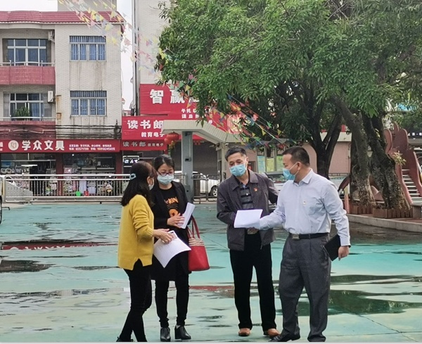 3月18日下午, 中山市教育和体育局郭勇、管淑花科长来到民众镇民众中心小学,对疫情防控及开学准备工作进行了全面的、深入的调研督查。