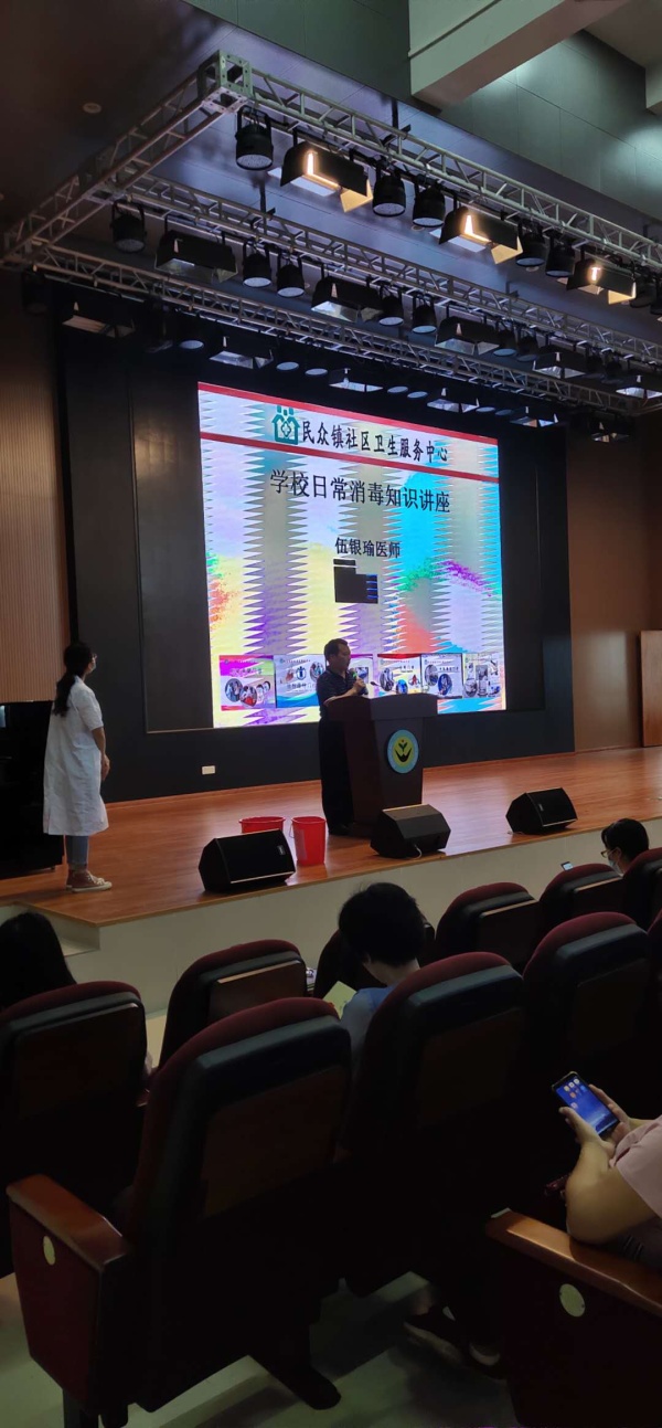 2020年5月14日,浪网小学进行了学校日常消毒培训。这次培训由该校校长刘伟胜主持,由民众镇疾控中心伍银瑜医师主讲,该校教职工共70多人参加了培训。