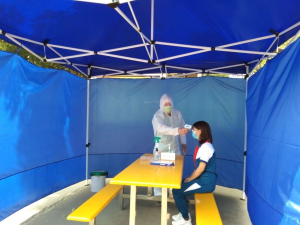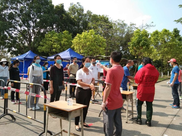 下午3点,演练正式开始。学校开放大门,由老师扮演的学生按照地面的1米距离标识保持间距,有序入校。校园门口设置了3条检测通道,每个通道配备一名老师进行体温检测和消毒。体温检测正常的学生进入教室,一旦发现有体温高于37.30C的师生,立即将其转移至观察室,重测体温,做好记录。并第一时间上报校长,同时联系班主任和家长。