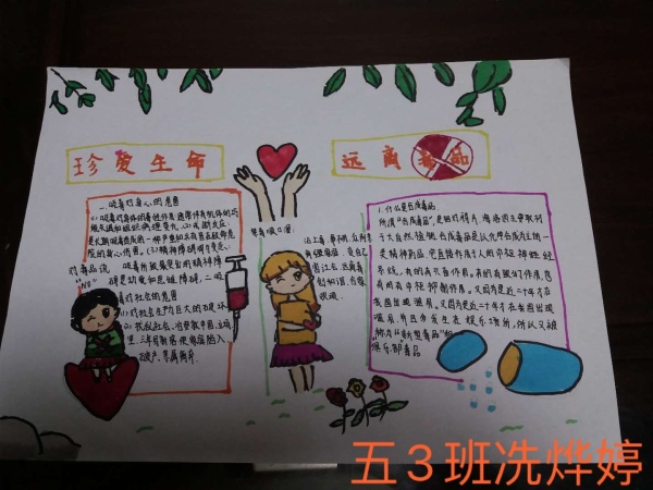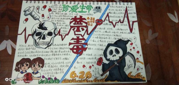 这次禁毒教育围绕“珍惜生命,拒绝毒品”为主题展开。同学们都积极参与,通过查阅各种资料,来创作和绘画,在上交的一幅幅手抄报中,形式多样、内容充实、色彩鲜明,有硬笔书画作品,有彩铅作品,也有水彩作品等等。同学们用资料、图片、漫画等多种生动的形式介绍了禁毒知识和毒品危害。