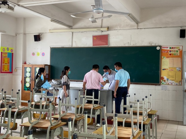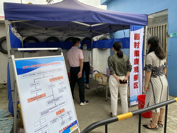 为切实做好开学疫情防控工作,保障全体师生的身体健康和生命安全,2020年5月9日上午,民众镇镇长黄声群、党委委员刘钊妍与谭伟强、卫健局罗财有、市场监管局崔泽华、疾控中心黄良辉、镇教育事务指导中心梁冬梅副主任、钟伟云、胡颖臻老师等一行人来到新平小学,对2020年春季四至六年级开学返校准备工作及疫情防控工作,进行督导检查;陆锐勋校长、汤斌英副校长、覃小梅卫生副校长以及学校新冠肺炎防控复学工作领导小组成员全程陪同。此次检查,通过听取汇报、现场检查、查阅资料的形式进行核验。