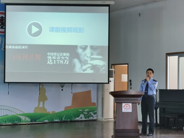 随后,市公安局禁毒支队程宏同志作《珍爱生命,拒绝毒品》专题授课,他从一段《与死神共舞》的视频导入,从毒品的由来、毒品的定义、毒品的种类、吸毒的方式以及毒品的危害五个方面详细地为同学们上了一节精彩的禁毒知识课堂。