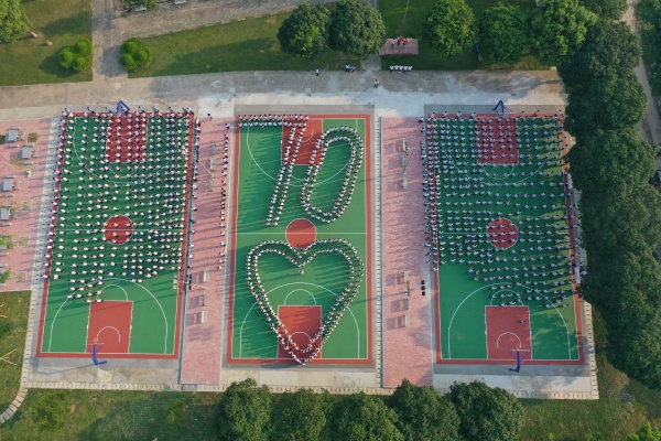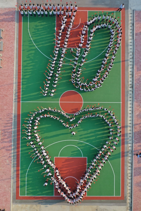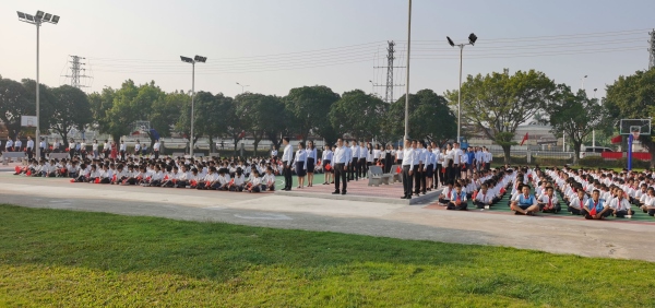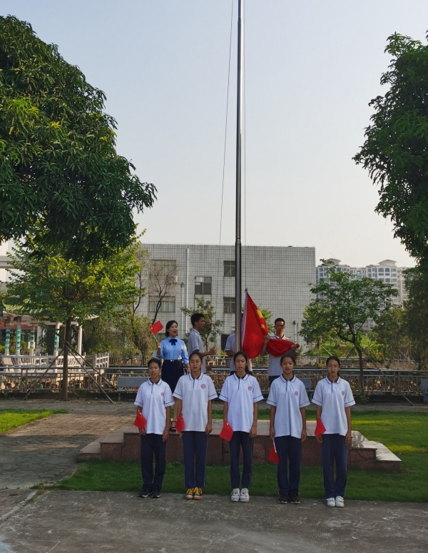 早上7:40分,全校师生手举国旗,有序地集中到篮球场。8点整,伴随着激昂的国歌,五星红旗冉冉升起。全校师生行注目礼,奏唱国歌。
