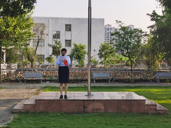 接着,田培利老师做了《祖国在我心中》的国旗下讲话。田老师从国防大学战略教研部金一南教授在2000年英国皇家军事科学的演说讲起,提到祖国从任人宰割到屹立于世界民族之林的历史变迁。田老师还列举了部分中国世界瞩目的成就,如:天眼、核电清洁能源技术、风力发电技术、太阳能发电技术、超高压输出技术、基建工程技术、人工智能等等,这些都是祖国强大的见证。田老师慷慨激昂的演说,进一步激发了全校师生的爱国情怀。
