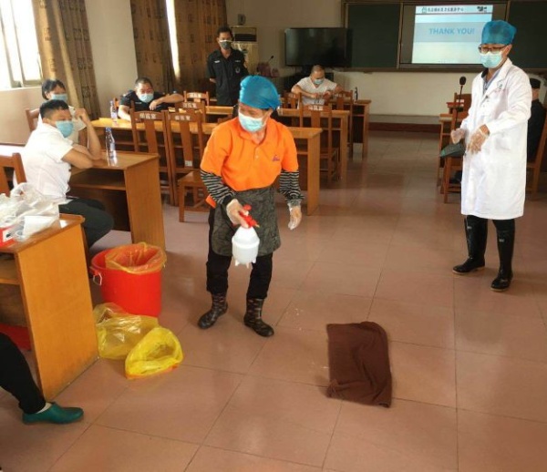 镇疾控中心黄良辉医生非常专业地向参加培训的人员详细讲解了教室、食堂、宿舍等场所消毒的流程、步骤及注意事项。黄医生从消毒剂的常用种类、消毒液的合理配制、如何科学规范使用消毒剂、消毒操作规范及注意事项、消毒喷雾器的选择等方面都作了深入细致地说明。另外,黄医生提醒宿管人员和食堂后勤人员,对学生的生活垃圾及饭后残余一定要处理好,时刻引导学生注意勤洗手、搞好个人卫生、养成良好卫生习惯。最后,黄良辉医生进行现场演练,并让民众中学相关人员反复练习以确保他们熟练掌握。