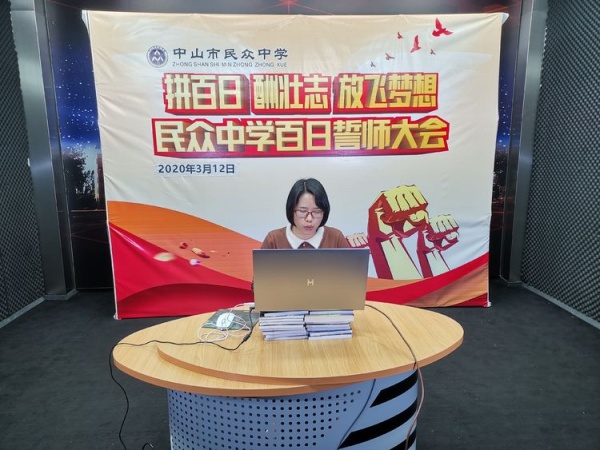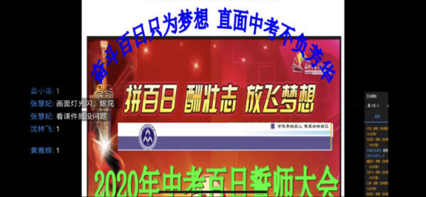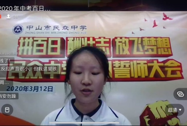由于新型冠状病毒肺炎疫情的影响,2020年3月12日晚上,民众中学召开了一场特殊的线上2020年中考百日冲刺誓师大会,全体毕业班师生和家长共同参加此次活动,杨盛影级长主持本次大会。