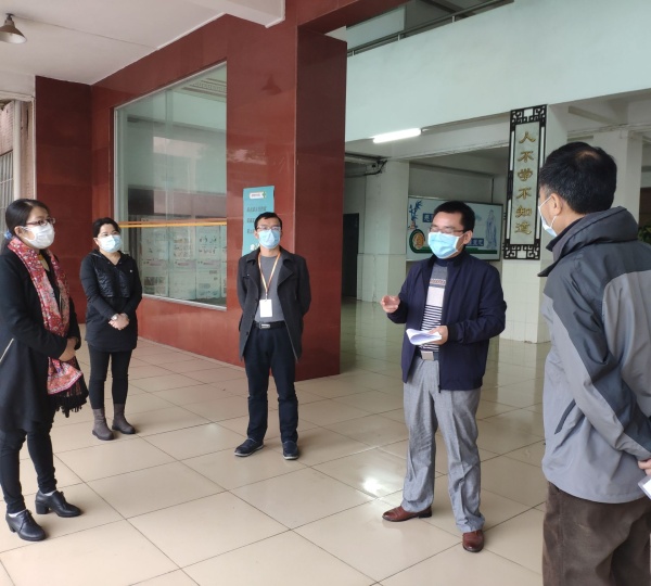 2020年2月14日下午,市教体局郭勇科长一行到民众中学指导疫情防控工作。民众中学校长胡留全、副校长何春华、总务主任李咸启、总务副主任梁玉婵热情接待郭科长一行并配合防疫指导工作。