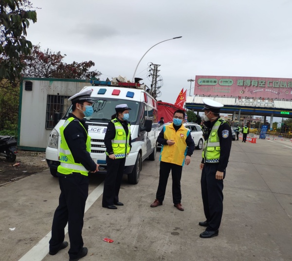 警民一心,阻击疫情。自新型冠状病毒引起的肺炎疫情发生以来,全国上下同舟共济,众志成城抗击疫情。目前,全国各地阻击疫情收到了一定成效,但抗疫形势还处于严峻阶段,专家呼吁绝不能松懈。为更好地发现疫情,阻击疫情,民众交警大队与民众医护人员在各重要交通要道出口设置了疫情检查站,不分昼夜对过往车辆上人员进行医学检测。他们对阻击疫情作出了最大的奉献,是“最美逆行者”。感谢、感动于他们的无私奉献,是日,民众中学志愿者、民众中学党支部部分党员携带着防寒凉茶、水果、饼干及口罩在校长胡留全的带领下前往民众镇浪网高速路口慰问正在检查疫情的警察和医护人员。胡留全校长代表志愿者和党支部对值班工作人员进行了暖心慰问,并与相关负责人进行了一些防疫措施的交流。