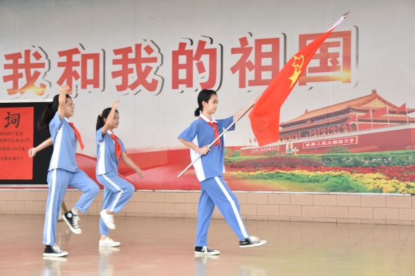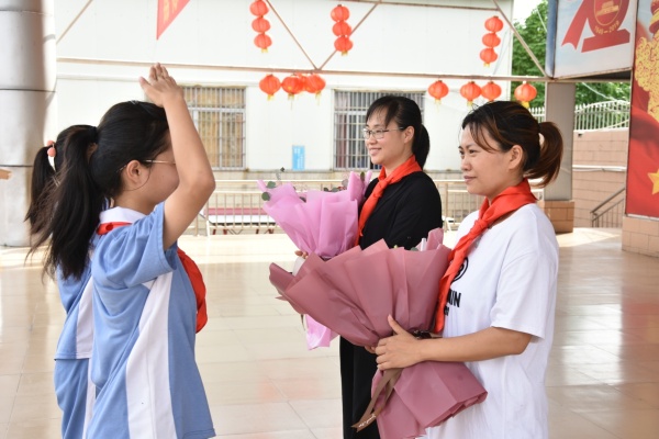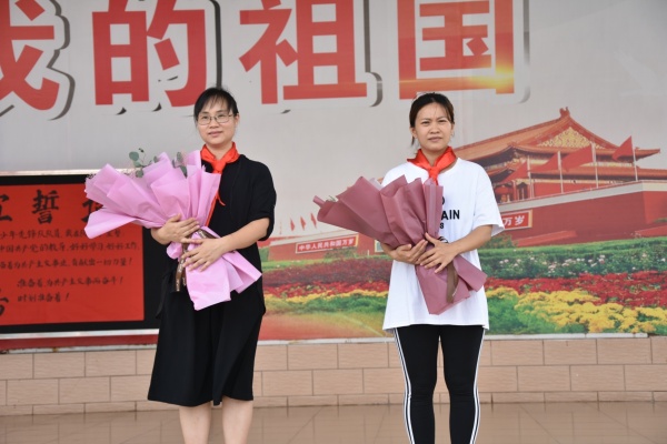 德育处植主任代表学校领导对新队员们表示了祝贺,同时还勉励新队员们要用自己的实际行动,证明自己无愧于少先队员的光荣称号!更要用自己的高尚品行和健全人格,为红领巾增光,为学校添彩!