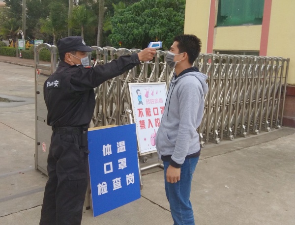 疫情发生后,学校及时实施了校园管制,由门卫实施二十四小时值班制。并在校门口设置了“体温口罩检查岗”,要求入校人员必须佩戴口罩,并对所有进入校园的人员进行体温检测,体温异常者禁入校园。目前,除个别值班的人员进入校园外,其他包括师生在内的一切人员均禁止出入校园。