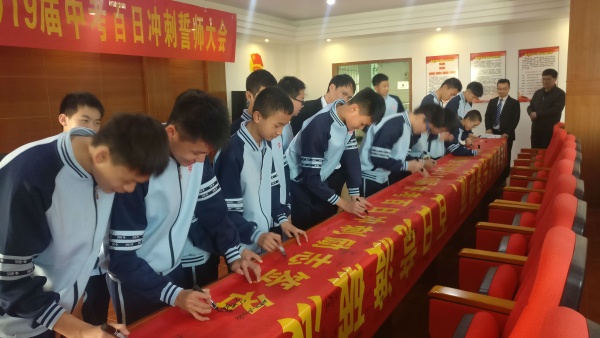 大会在庄严的国歌声中拉开了序幕。首先是九年级教师代表李伟平老师做中考动员讲话,分析学情教情,指导复习方法,李老师勉励同学们:只要信心不滑坡,办法总比困难多。惜时如金,读书趁年华。接着是九年级学生代表陈建川同学表态发言,决心遵照学习计划,珍惜分分秒秒,夺取优异成绩。“狭路相逢勇者胜”无疑是全体同学的百日铮铮誓言。随后,教导处邓新军主任与全体同学分享了他的三个想法:第一个想法,求学从来都是艰苦的,备考的第一准备,要有能吃苦的精神。第二个想法,对中考要满怀信心,有坚定的信心,才会漠视脚下的坎坷。第三个想法,中考路上贵在坚持,咬紧牙关才能吹响胜利的号角。邓主任的三点分享鼓足了同学们的士气,一扫眼前迷雾。