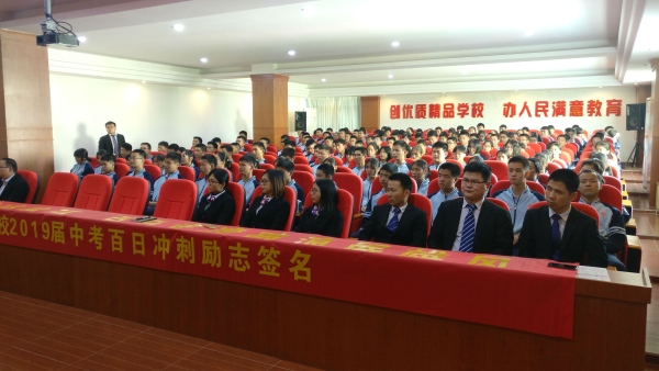 南国三月,陌上花开蝴蝶飞。连续一周的雨水天气渐渐退去,迎来了期盼已久的暖阳。趁着春光烂漫,3月11日下午1点40分,中山市民众德恒学校在多媒体会议室举行了2019届中考百日冲刺誓师大会。德恒学校义教部行政、九年级全体师生齐参与本次大会,大会由姚若彤老师负责主持。
