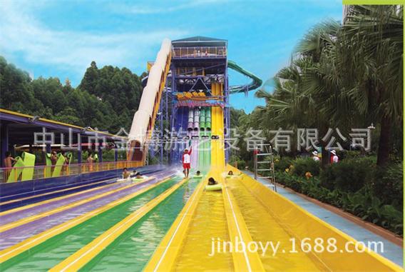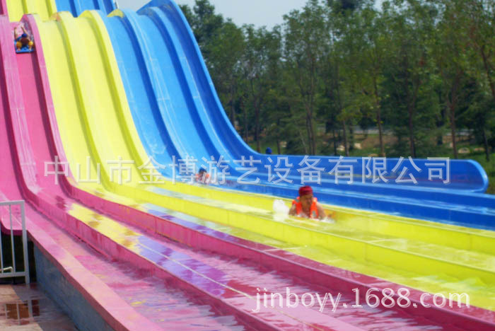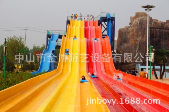 彩虹竞赛滑梯同样是一类非常经典的水上乐园游玩水滑梯,多可以多道并列设计,一般为3~10道,可以用身体或浮垫滑行。参与者可以同时出发进行比赛,滑道中间会设计一系列刺激的小坡,参与者们都将一一通过它们,最终冲向终点线。该设备的参与和互动性非常强,同时具有很强的接待能力,让游客可以多次参与到比赛当中,获取欢乐和畅快的独特体验。