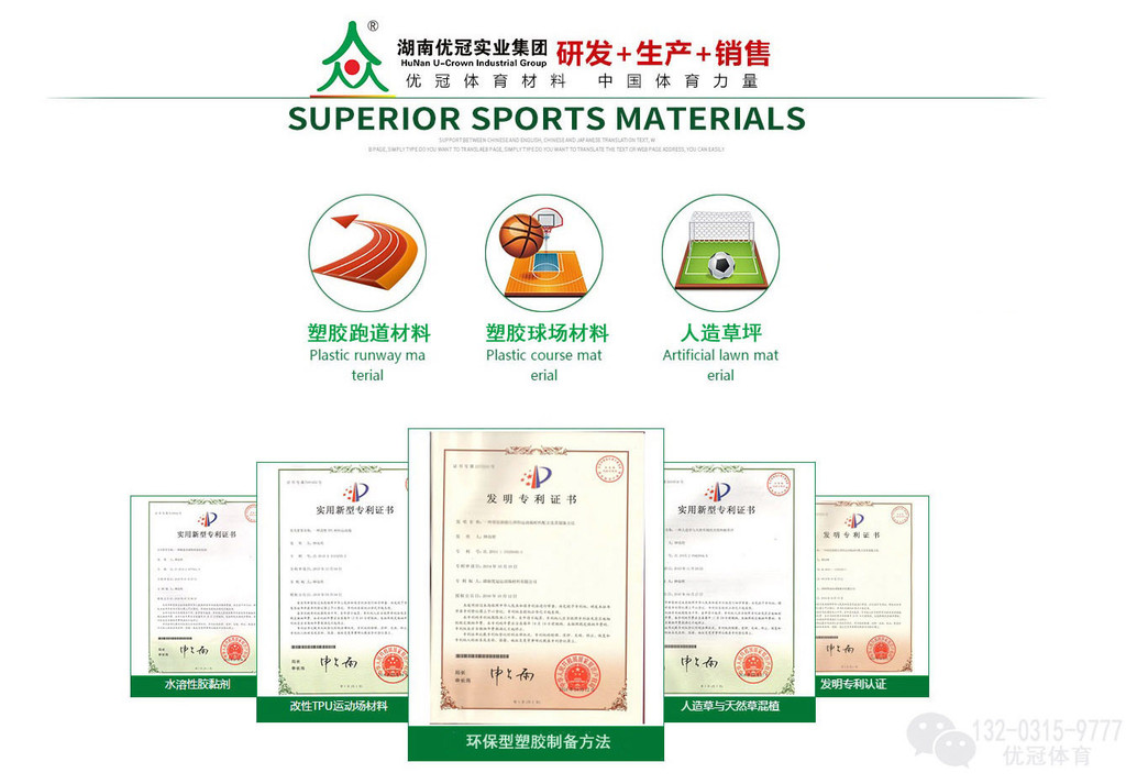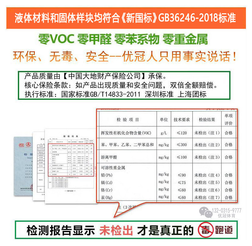 优冠牌塑胶跑道材料、塑胶跑道胶水、双组份PU聚氨酯、EPDM颗粒、水性硅pu球场材料、均通过