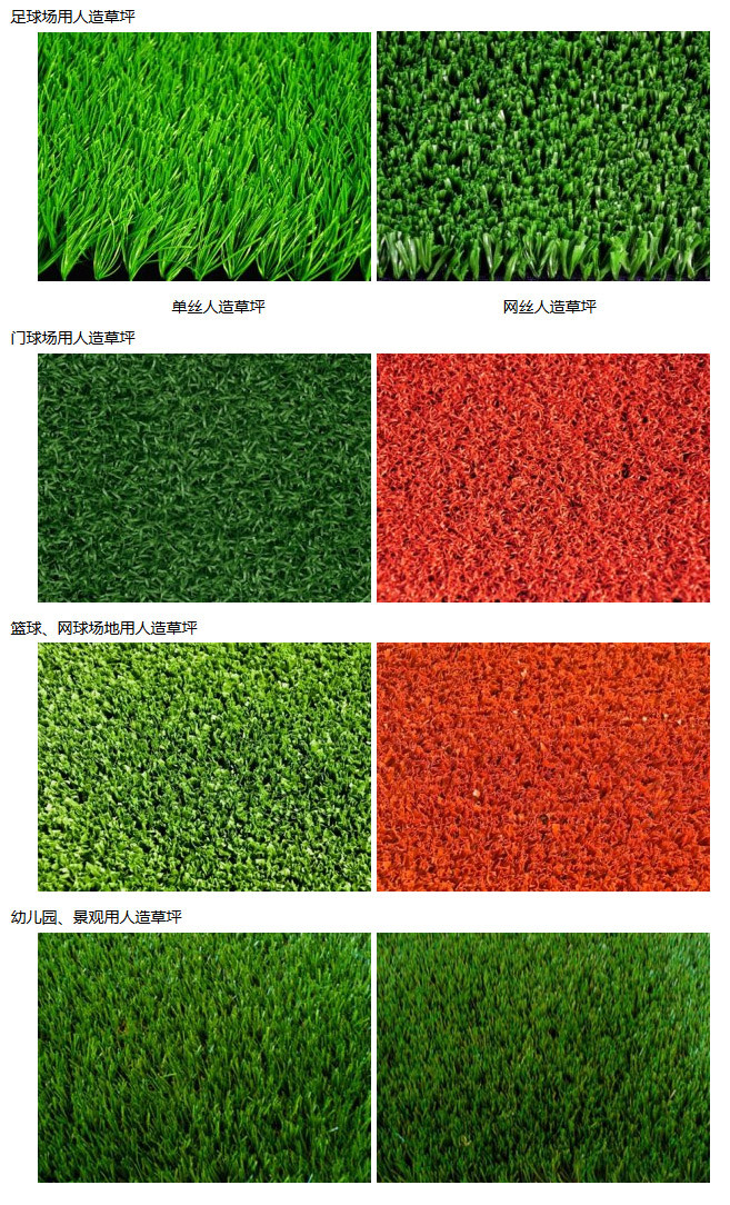 人造草坪是新一代运动场地良好的地面材料,在外广泛使用,目前在各地蓬勃兴起,应用广阔。人造草坪由纤维织成,它具有、耐紫外线、舒适、平坦均匀、耐低温、防滑、弹性好、场地硬度调节适当、全天候使用和清洁方便、使用寿命长,并有良好的透气性和透水性。人造草坪有适合于运动场的品种,如足球场、网球场、篮球场、排球场、门球场、跑道等。