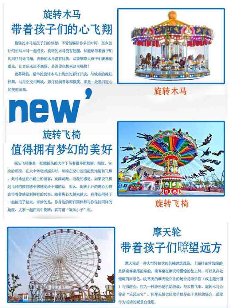 主营产品为:过山车、摩天轮、大型飞椅、转马、滑车、玻璃吊桥、小火车、大摆锤、玻璃栈道等机械设备和景区户外设备,星空体育相信通过星空体育的不断努力和追求,一定能实现与客户的互利共赢。