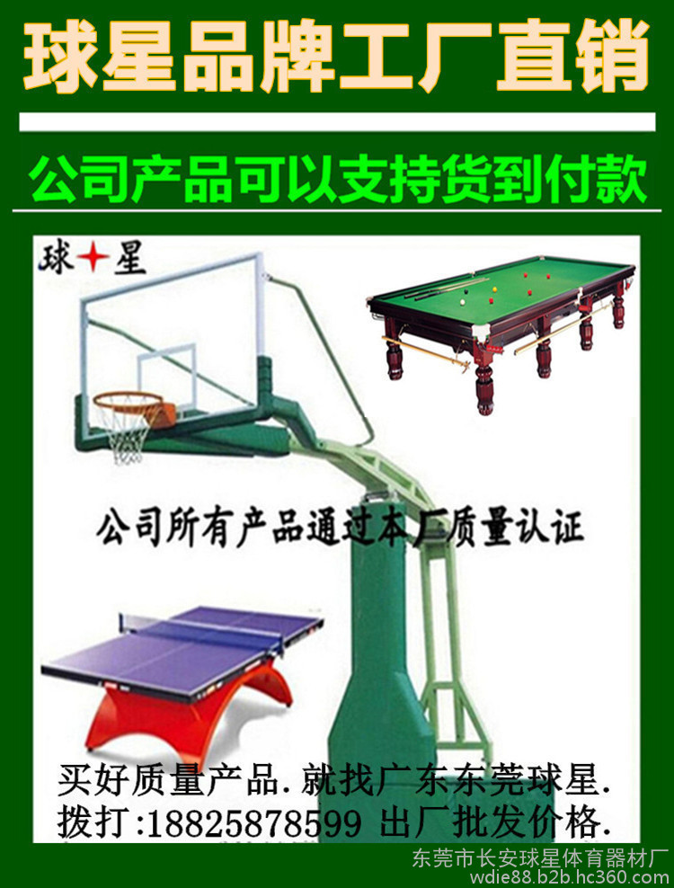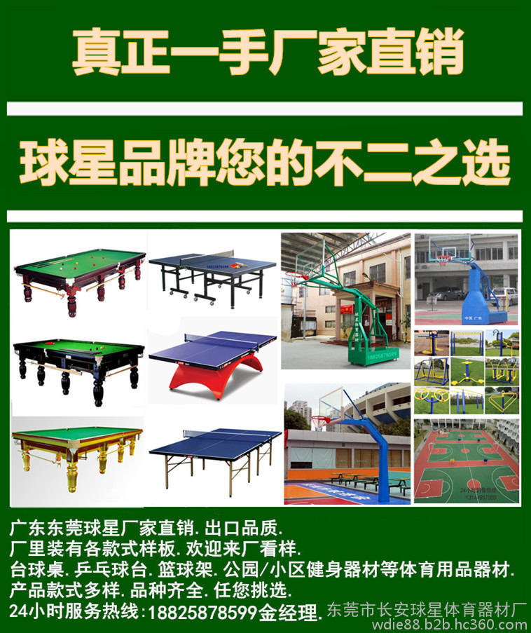 东莞市长安球星体育器材厂集三十多年管理、制造经验,专业制造桌球台、乒乓球台、篮球架、桌上足球.公园.小区健身器材等./等体育用品。秉着质量至上,信誉好的原则,所做产品深受客户好评。桌球台、乒乓球台、篮球架.桌上足球.公园小区健身器材五个系列产品远销欧洲,南、北美洲,澳大利亚及部分阿拉伯**。