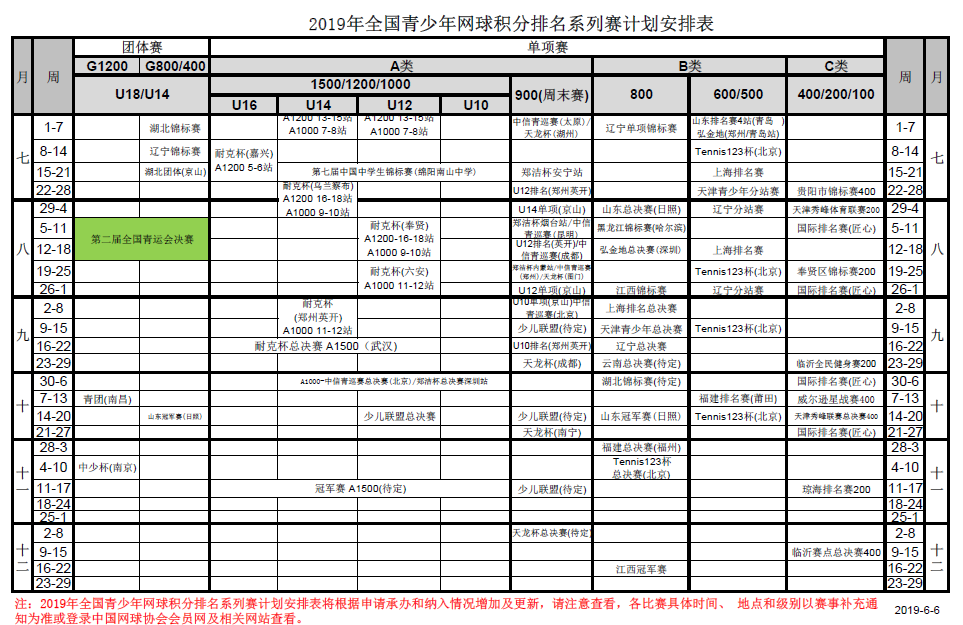 2019年全国青少年网球积分排名系列赛竞赛计划安排表