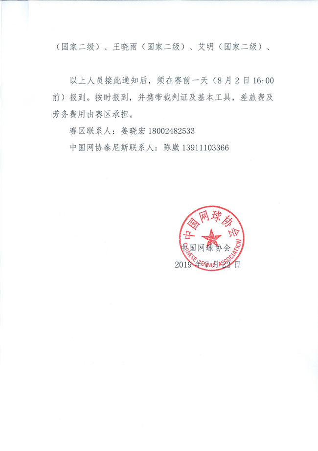 关于选派2019年中国业余网球公开赛阜新白金赛技术官员的通知