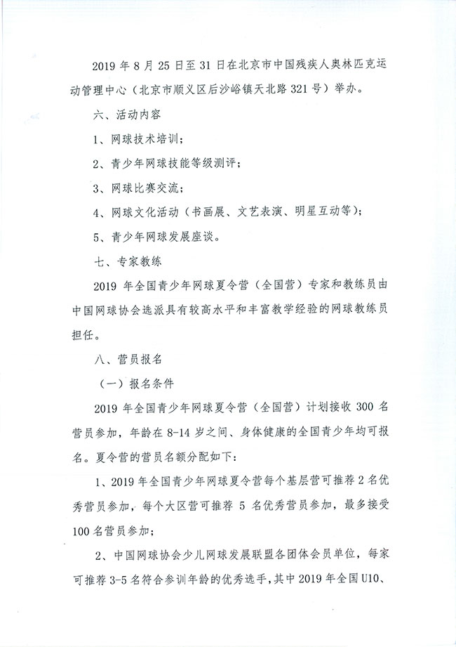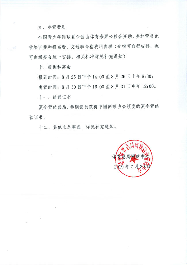 关于举办2019年全国青少年网球夏令营(全国营)的通知