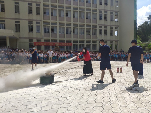 活动最后,消防员向同学们讲解了消防车的构造和功能、模拟消防车水枪参与灭火的场景。除此之外,现场示范和讲解灭火器的使用步骤和注意事项,并由教师代表操作灭火器进行现场灭火演练。