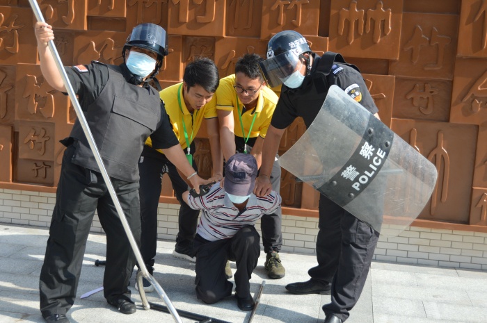 演练开始,校门外一名暴恐分子假称学生家长(上课时间不允许探望)探望小孩为由无视保安的劝阻,强行闯入校区并掏出凶器,寻机准备伤害学生。一名保安迅速戴头盔持战术盾牌、橡胶棍、赶到现场,阻止犯罪分子向学生集中处靠近,把同学保护在身后,与犯罪分子对峙,同时喊话“放下武器,不要闯入校区伤害学生。”另一名保安按下“一键式报警器”并拨通校防暴反恐组组长电话报告情况。应急小组即刻报告校长,启动应急预案,全体师生开始迅速往安全区域逃离。各班老师立即将教室的门、窗户关紧上锁,并保护孩子躲避到安全区域。防暴反恐组接到警报后,手持“长柄的防暴叉”、“警棍”等武器从四周冲向“歹徒”,实行截堵,并与“歹徒”周旋。经过搏斗,最终成功将“歹徒”制服,押送派出所处理。