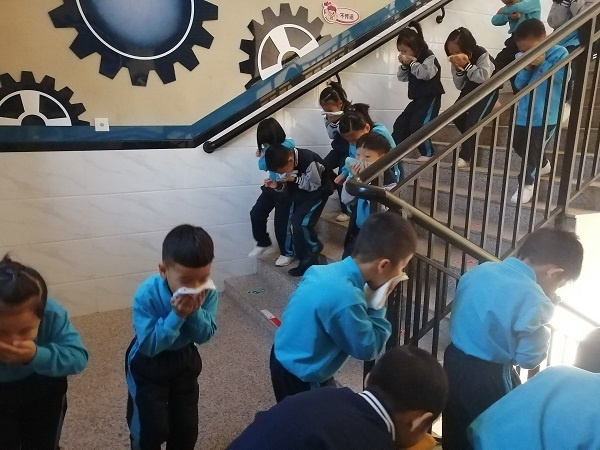 上午9:00警报声响起,消防安全疏散应急演练开始。各楼层负责疏散学生的老师迅速就位,各年级学生在班主任老师的指挥下,分别从教室的前后两个门离开,俯身捂住口鼻,沿着右墙角边不抢道、不惊慌,按指定路线快速、有序地向操场疏散。