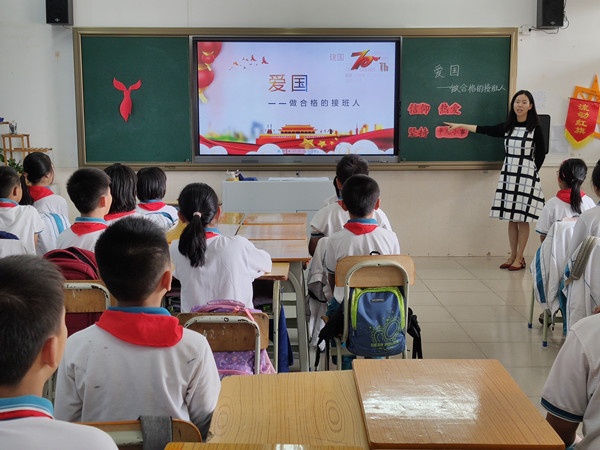糜秀慧子老师以“做合格的接班人”为题,开篇先让孩子看“江姐”的故事,让孩子明白先烈们爱国的坚定信仰。接着观看新中国成立70周年取得的伟大成果,学生讨论热烈,踊跃发言,纷纷为祖国的发展感到自豪。糜老师通过具体的行为使学生明白爱国的具体做法,最后以重温入队誓词,歌唱队歌两个环节对学生的情感进一步地熏陶。