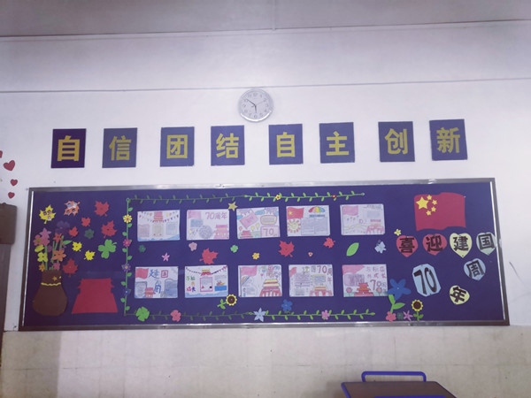 一进校园,一派喜庆。学校张灯结彩,挂满了红灯笼和小红旗,在杨仙逸铜像旁边还立着一块大大的展板写着祖国母亲70年的辉煌历史。在德育处和美术老师的安排下,学校还举行了“喜迎70华诞,向祖国致敬”的主题绘画和手抄报比赛。学校小礼堂的板报布置别具风格:有同学们的书法作品、绘画和手抄报作品。无论是一二三年级的绘画还是四五六年级的手抄报,每一副作品都表达了孩子们对祖国母亲的热爱之情。