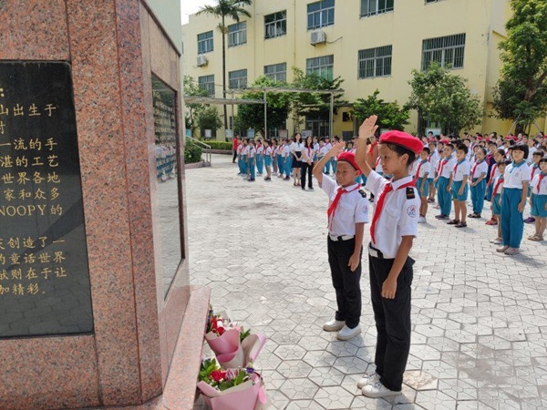 随后,在北台小学杨仙逸铜像前,再次举行了缅怀仪式。首先,由学生代表向杨仙逸将军像敬献花篮,向将军默哀一分钟。整个校园列队整齐、庄严肃穆,表达对将军的深切哀悼和无尽的敬仰之情。接着,由少先队员代表金琦雯发表讲话,对将军在中华民族面临生死存亡的危险时刻,毅然选择尽心尽力报效祖国的崇高爱国精神表达敬意,号召大家肩负起历史的使命,发奋学习,为国添彩。最后,辅导员莫冰发表讲话,为一年级新生讲述了杨仙逸将军组织飞机队的故事,强调了志在冲天精神对北小学子的深刻意义,鼓励队员们刻苦学习,为了祖国更加强盛而奋发努力,以自身的实际行动来告慰英灵。