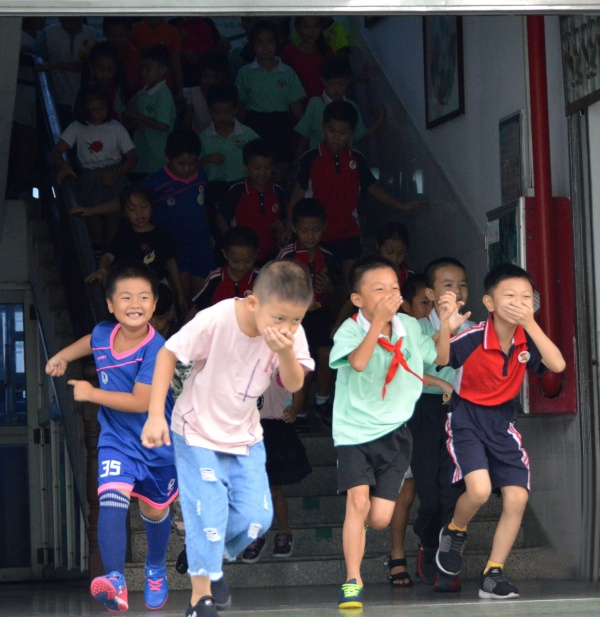 9点整,校园突然警报长鸣,在相关老师的协助引导下,全校1700多名师生按照预先布置的撤离路线从教学楼快速、有序地跑下楼梯,奔向操场集合,并清点人数报告总指挥。在有大量一年级新生第一次加入演练情况下,整个过程用时2分多钟,逃生演练的效果非常显著。