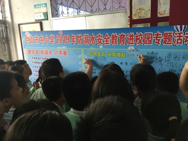活动最后,此次公益讲座的主办方还给竹秀园中心小学进行授牌仪式,与大家互动并拍照留念,将此次公益讲座活动推向了高潮。最后,同学们在活动的宣传画报上签下了自己的名字,并表示要将今天的学习成果传授给班中的其他同学,并讲给家长和朋友听,积极宣传游泳安全与应急自救,大家共同努力,学会保护自己,严防溺水事故的发生。