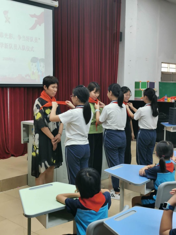 因为疫情影响,今年的一年级入队仪式显得简约却不失仪式感。整个活动共设主会场和分会场。主会场在多媒体教室,有一年级和六(3)中队参加。分会场则各班统一开展少先队基本礼仪规范培训。
